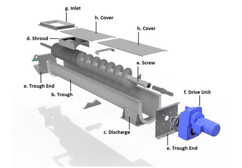 Paddle Screw Conveyor is mainly composed of driving device, head section, middle section, tail section, head and tail bearings, feeding and discharging device and other parts.