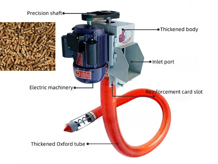 The Biomass Pellet Flexible Screw Conveyor consists of a screw shaft, conveying pipe, motor, and inlet/outlet ports. The screw shaft uses a high-hardness alloy coating process, and the conveying pipe is made of wear-resistant polymer material, which can withstand continuous friction from biomass pellets, extending its service life by more than 50% compared to ordinary parts. The inner wall of the conveying pipe is mirror-polished, and the screw blades feature an optimized arc design to avoid pellet collision and compression, reducing breakage and dust generation, and ensuring pellet integrity. The components feature a modular assembly structure, allowing for free adjustment of the conveying direction and length to adapt to different layouts in biomass production lines.