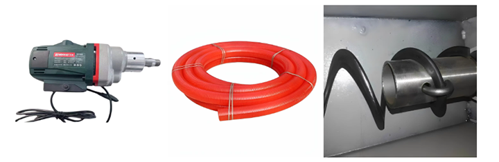 The motor is a geared motor with variable frequency speed control and an IP55 or higher protection rating, providing dust and water resistance. The hose is made of PU material, which is wear-resistant, while the smooth inner wall of the pipe prevents diatomaceous earth powder from getting stuck and bacteria from growing. The helical spring is made of high-strength carbon steel or 304/316 stainless steel, resisting slight abrasion from the diatomaceous earth and allowing for quick removal for cleaning after use.