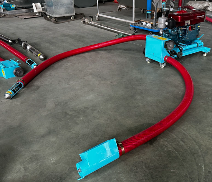 The Flexible Screw Conveyor for Carbon Black includes a motor, inlet and outlet ports, hoses, and a flexible screw conveyor. The motor, reducer, and sealed transmission box are the core power source. The inlet port is typically equipped with an interface for connecting to a silo or storage tank, while the outlet port discharges carbon black into mixers, packaging machines, etc., and can be equipped with a rotary valve or gate. The flexible conveying screw pushes the material, and the conveying hose forms the conveying channel. The control system includes a frequency converter, start/stop switches, and interlocking protection devices.
