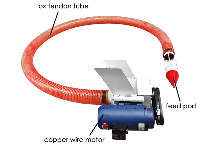 In terms of conveying capacity, a 50mm pipe diameter can handle approximately 0.5-1.5 cubic meters of resin per hour, a 63mm pipe diameter increases the conveying capacity to 1-3 cubic meters per hour, a 90mm pipe diameter can convey 4-12 cubic meters per hour, and a 115mm pipe diameter can reach a maximum conveying capacity of 8-30 cubic meters per hour. The conveying capacity is affected by factors such as resin density, moisture content, and system tilt angle. For resins with poor flowability, a design with a larger screw pitch can be selected; while for resins prone to static electricity, models with anti-static coatings or grounding systems should be selected.