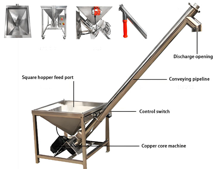 The powdered premixed material screw conveyor consists of a drive unit, a helical shaft and blades, a conveying housing, an inlet, an outlet, and a support and sealing system. The drive unit provides stable power to the entire machine and can be equipped with a frequency converter for stepless speed regulation; the screw shaft and blades push the powdered premix forward through rotation; the conveyor shell serves to bear, guide, and prevent dust from entering, thus avoiding leakage of the powdered premix; the feed inlet can be connected to upstream silos or metering equipment to achieve continuous and uniform feeding; the discharge outlet can be connected to downstream processes for unloading.