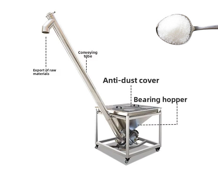 The Sugar Crystals Inclined Screw Conveyor's component assembly includes a drive unit, screw blades, inlet, barrel, and outlet. Depending on the characteristics of sugar crystals, the spiral blades can be full-surface, belt, or paddle type. The blade surface is usually polished to reduce friction and ensure smooth conveying. The feed inlet can be designed for end feeding or center feeding to adapt to different feeding methods. The barrel generally uses a closed U-shaped groove or round tube with a smooth inner wall. The tilt angle can be adjusted between 15° and 45° to reduce friction between the sugar and the barrel wall. To prevent sugar clumping, some models have a small stirring device at the feed inlet to gently break up clumps and avoid blockage; some models use a variable pitch design, with a larger pitch at the feed end and a slightly smaller pitch at the conveying end, ensuring stable sugar flow during inclined conveying and preventing backflow of sugar crystals.