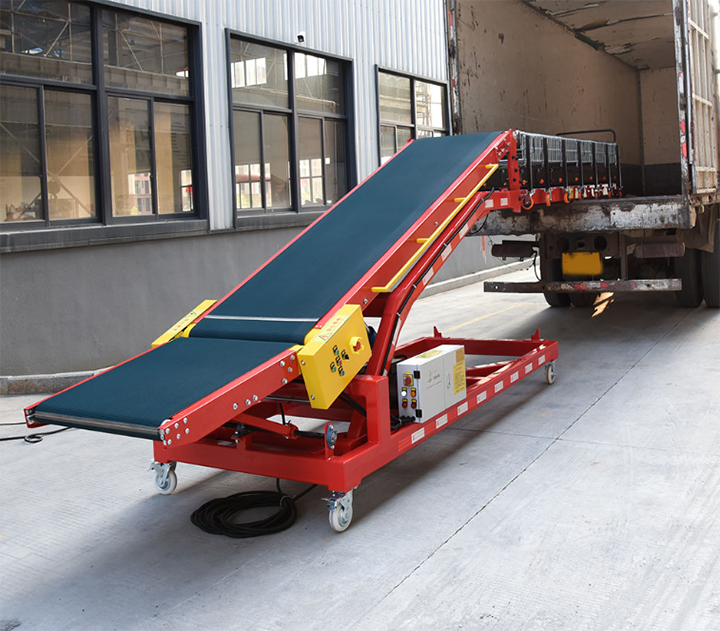 Belt conveyors use an electric roller to drive a circular belt, on which materials are continuously transported. Belt conveyors can be made in stationary, mobile, and telescopic types. Mobile belt conveyors are commonly used to receive bulk materials under truck unloading hatches, while telescopic belt conveyors can penetrate deep into truck beds for rapid transport of packages. Common belt conveyor conveying capacities range from 100–5000 t/h, and their length can be freely configured according to site conditions.