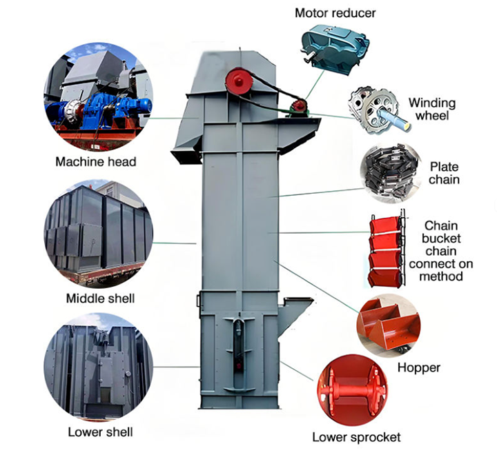 To realize the Working Principle of Plate Chain Bucket Elevators, the plate chain bucket elevator consists of traction components, load-bearing components, a drive unit, a tensioning device, running components, and support and sealing structures.