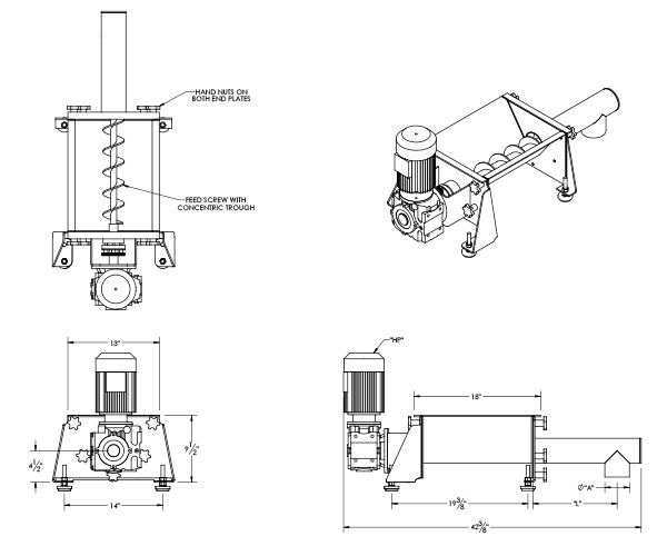 1. Silo: The volume ranges from 1L to 1000L, which can be round or square; it can be open or covered, and a seal can be set; when the volume of the silo is large, it is generally necessary to add or reduce weight cones to prevent the material in the silo. The weight is pressed on the screw shaft, which increases the load and affects the normal operation.